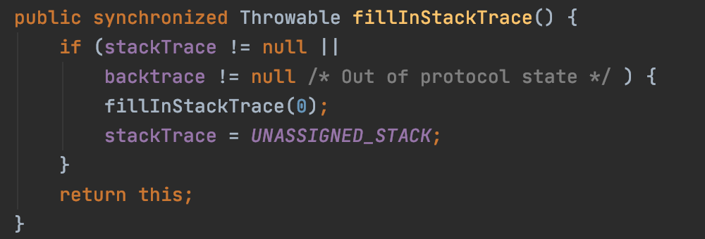 public synchronized Throwable fillInStackTrace() {