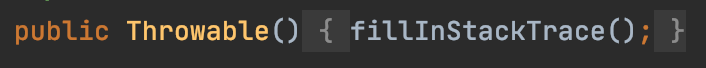 그리고 우리는 출력된 StackTrace를 통해 예외가 어디서 어떠한 이유로 발생했는지 알 수 있는거죠. 하지만 보통 Custom Exception은 유효하지 않은 값이라면 하위 비즈니스 로직을 수행하지 못하도록 하기 위한 용도일 때가 많습니다. 따라서 이 때는 현재 값이 어떤 call stack을 가지는지에 대한 정보가 필요 없어지고, StackTrace를 생성하지 않도록 해도 괜찮은 상황인것이지요.